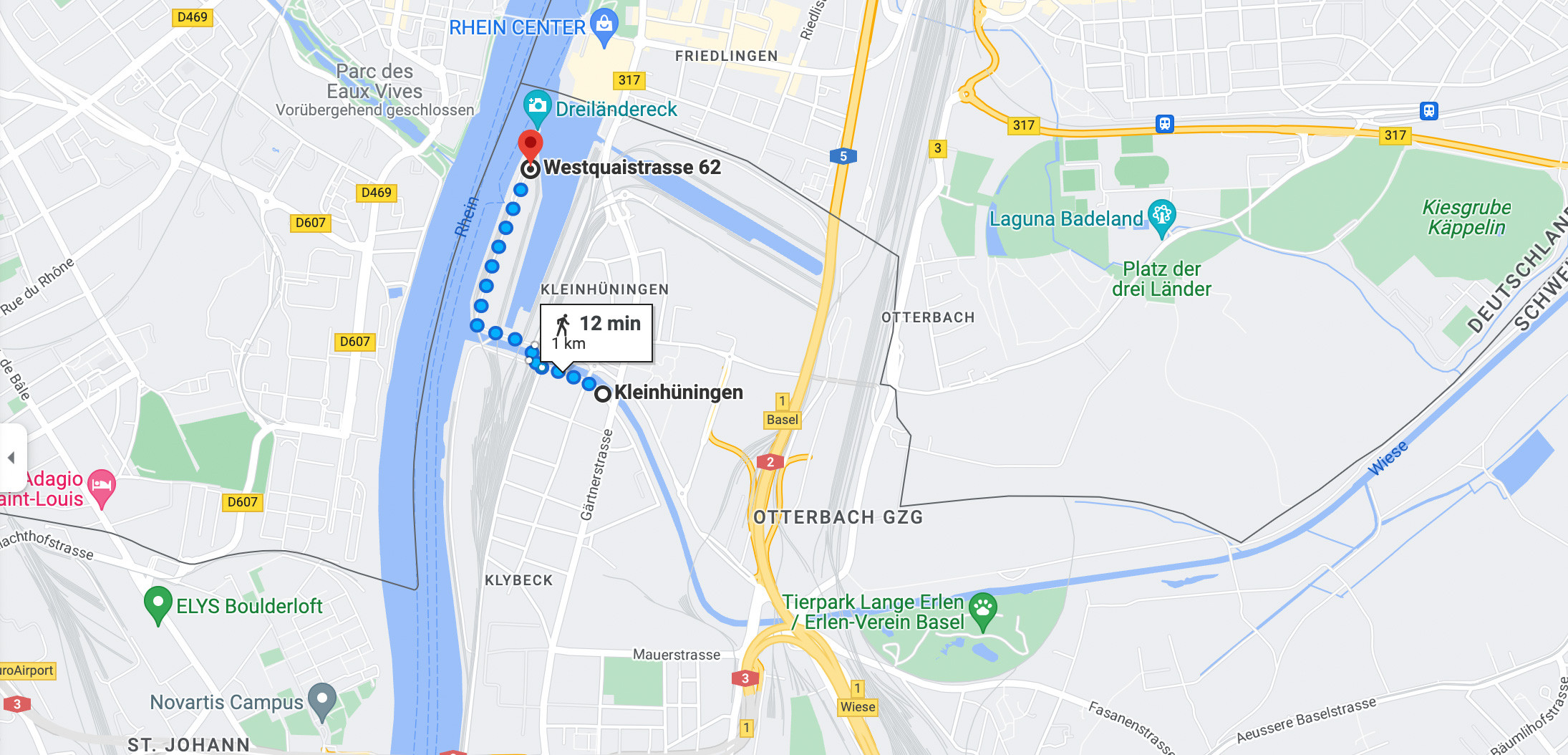 Mit OeV: Tram Nr. 8 Richtung Kleinhüningen/Weil am Rhein bis Haltestelle Kleinhüningen. Anschliessend ca. 10 Minuten Fussweg: