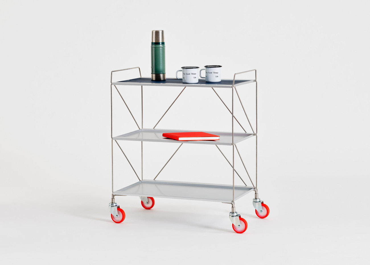 Die STM2-Kombination "Servierboy" verfügt über textilummantelte Griffe und grosse, orangefarbige oder schwarze Rollen, jeweils zwei davon auf Wunsch mit Feststellern. In wahlweise schwarz oder weiss beschichtetem Sperrholz, mit einfach gesteckten Stell- und Sperrbügeln aus geschliffenem Edelstahl. Der Servierboy ist in zwei Grössen erhältlich.