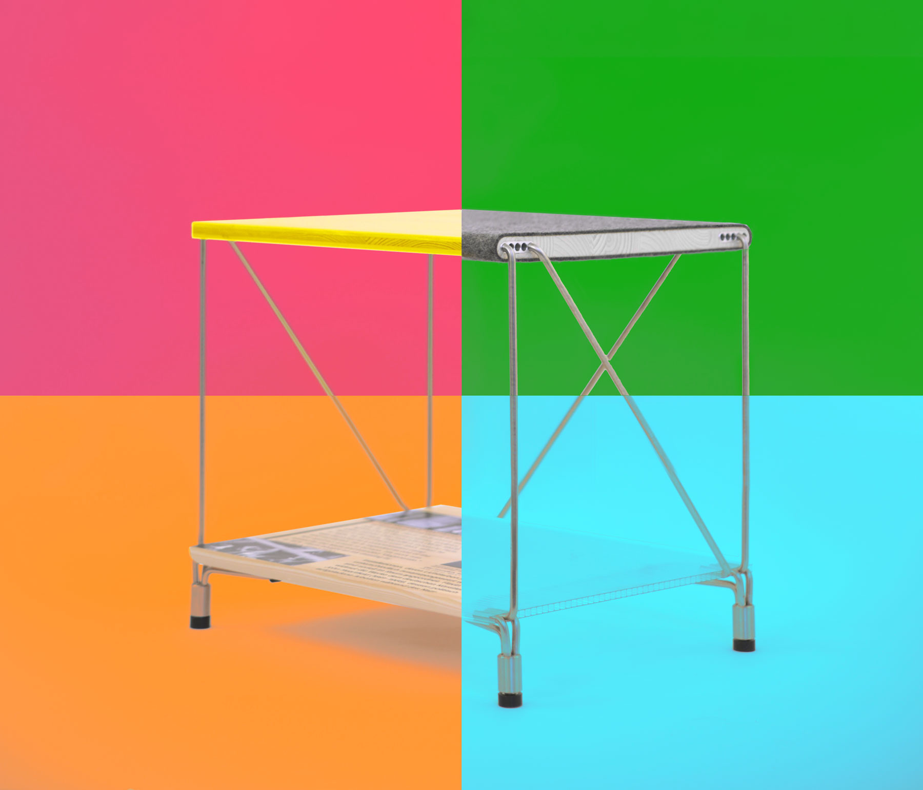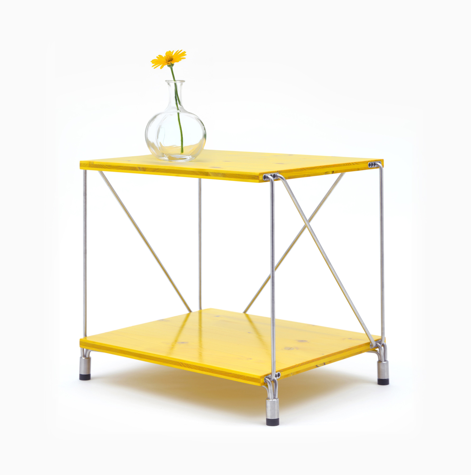 Strahlend gelb wie die ersten Frühlingsblüten leuchtet das kleine STM2-Beistelltischchen. Das Material erinnert an Baustellen, an Betonschalungen, Bauzäune, an die Entstehung von Neuem, an Transformation.