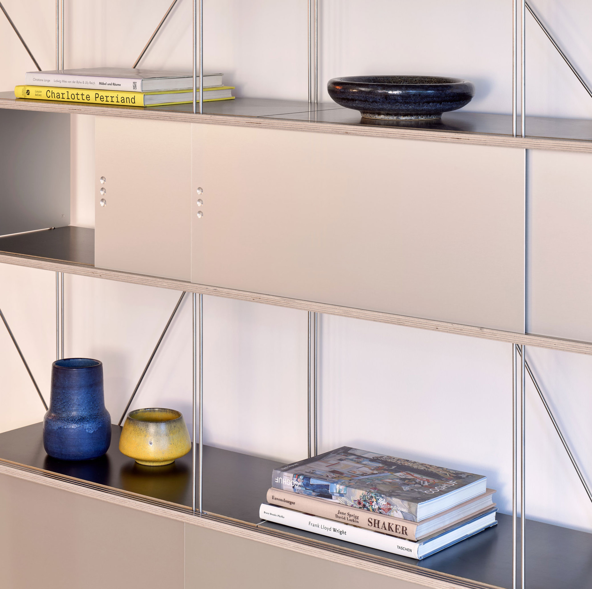 Nahtlos fügt sich die neue Erweiterung unseres Regalsystems STM2 ans Bestehende. Ein paar Handgriffe genügen: Gleitschienen anstecken, befestigen, Schiebetüren aus eloxiertem Aluminium einsetzen. Gezielt da und dort - oder als komplette, geschlossene Front.