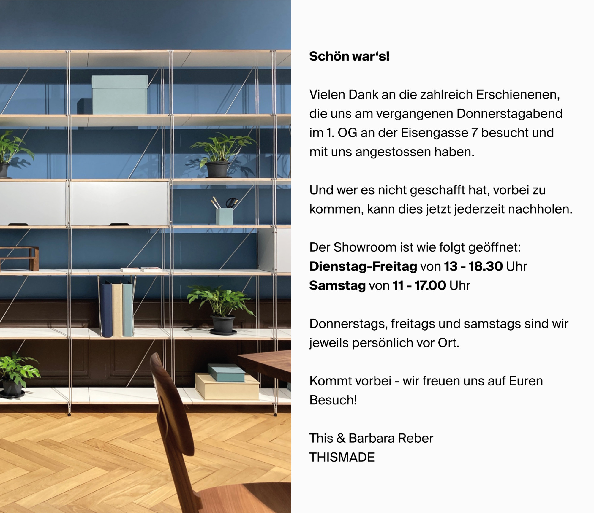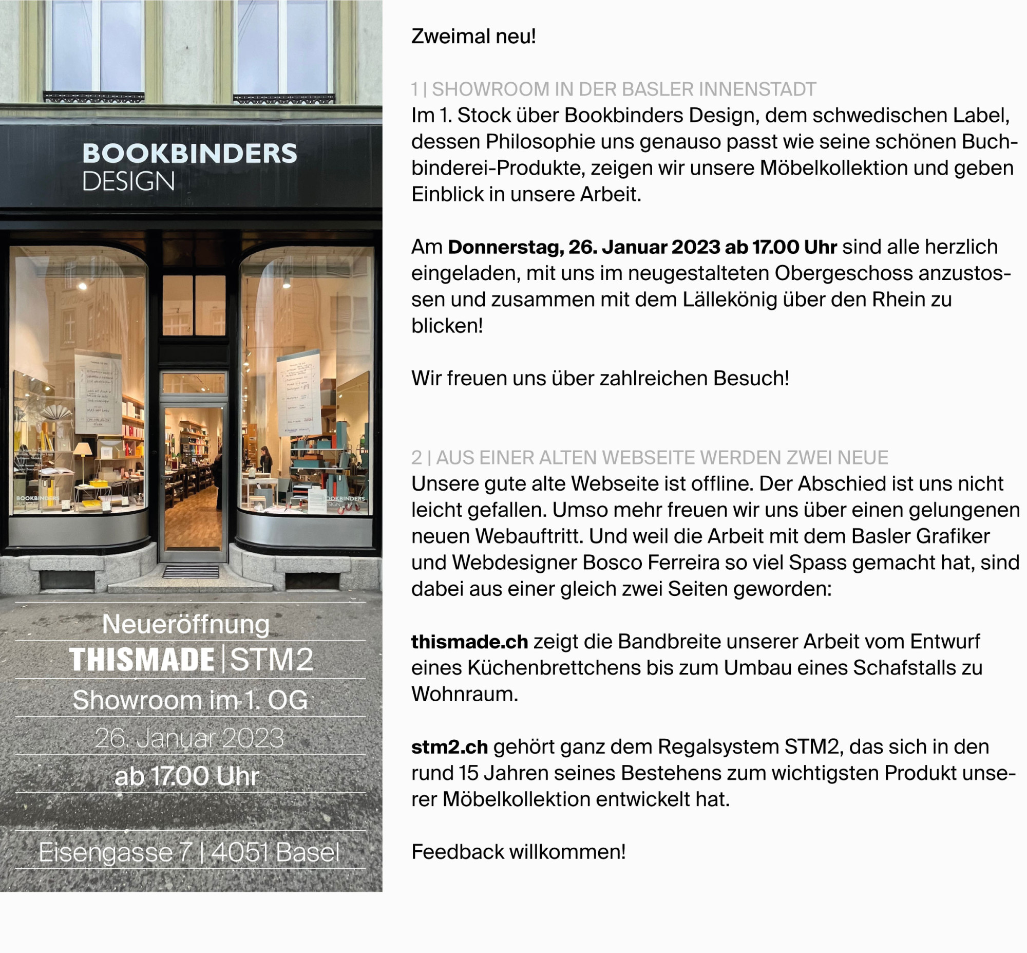 Save the date: am Donnerstag, 26. Januar 2023, 17.00 Uhr eröffnen wir unseren Showroom im Obergeschoss von Bookbinders Design an der Eisengasse 7 in der Basler Innenstadt!